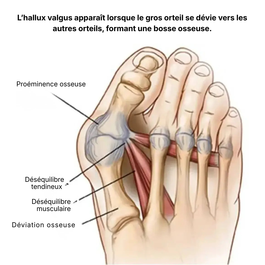 L'hallux Valgus est causé par un désalignement progressif de l’articulation du gros orteil, qui perturbe l’équilibre musculaire du pied.